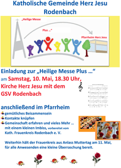 Für Samstag, 10. Mai, lädt die katholische Gemeinde Herz Jesu Rodenbach wieder zu einer „Hl. Messe Plus ...“ ein.