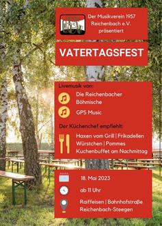 Am 18. Mai 2023 veranstaltet der Musikverein Reichenbach sein traditionelles Vatertagsfest in der Bahnhofstraße am Raiffeisengebäude in Reichenbach-Steegen.