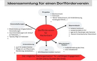 Alle Interessierten sind dazu herzlich willkommen, um sich mit ihren Ideen einzubringen. Auf dem Schaubild sind die Ergebnisse aus den ersten Treffen zusammengefasst. Jetzt soll es auch um die Modalitäten der Gründung gehen.