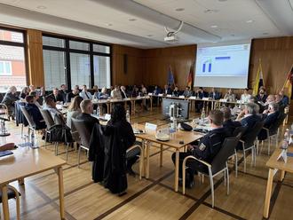 Landrat Ralf Leßmeister begrüßte die politischen Vertreterinnen und Vertreter der Garnisonskommunen sowie zahlreiche hochrangige Vertreter und Offiziere der US-Streitkräfte, darunter Angehörige der US-Army und der US-Airforce. Eingeladen hatte Generalmajor Paul Moga, der durch eine umfangreiche Tagesordnung führte.