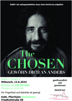 Herzliche Einladung zur Episode 3 von The Chosen am Mittwoch, 12. Juni 2024 im Kath. Pfarrheim in Rodenbach, Friedhofstraße 58. Einlass ist um 18:30 Uhr. Filmbeginn um 19:00 Uhr. Der Eintritt ist frei.