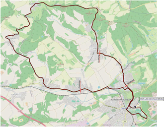Auf dem abgebildeten Plan ist der genaue Streckenverlauf abgebildet. Es wird auf dem Rundkurs drei Querungsstellen geben. Eine Querungsstelle befindet sich in Miesenbach an der Neuwoogstraße – Altenwoogstraße, über die Ramsteiner Straße drüber, eine weitere in Kottweiler an der Eckstraße – Turmstraße über die Miesenbacher Straße drüber und die letzte in Steinwenden an der Eisenbahnstraße – Marktstraße über die Moorstraße drüber.
