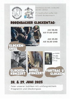 Im Rahmen der 725-Jahr-Feier der Gemeinde Rodenbach lädt die katholische Kirchengemeinde Herz Jesu am Samstag, 28. Juni, ab 17:00 Uhr und Sonntag, 29. Juni, ab 10:30 Uhr, herzlich zum "Glockentag" ein. Anlass sind mehrere Weihejubiläen der Kirchengemeinde, die u. a. beim Familientag des Kreises gemeinsam gefeiert werden sollen.