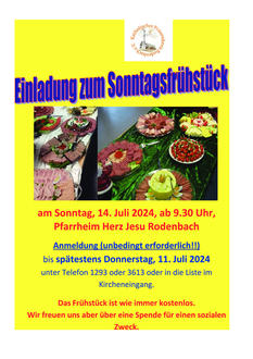 Am Sonntag, 14. Juli, lädt der Katholische Frauenkreis Rodenbach zum Sonntagsfrühstück ins Pfarrheim Herz Jesu ein.