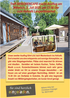 Es geht am Mittwoch, den 6. August, wieder zur Fritz-Claus-Hütte, Martinshöhe. Sehr schöne PWH, klasse Pfälzer Spezialitäten, es gibt auch Seniorenteller, Kuchen, Kaffee... Preis-Leistung einfach super. Abfahrt 12:45 Uhr am Dorfplatz in Eulenbis. Meldet Euch rechtzeitig an.