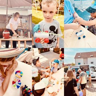 Aus Actimel-Fläschchen, Flaschendeckel, Strohhalmen und Luftballons konnten selbstfahrende Autos gebastelt werden. Außerdem wurden Blumen gestaltet, mit Hilfe von Pfeifenputzern, Filtertüten und Wasserfarbe.