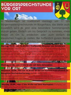 In Mackenbach ist traditionell montags um 17 Uhr Bürgermeistersprechstunde im Bürgerhaus, das bleibt auch. Zusätzlich wird es jetzt eine besondere Sommersprechstunde geben. Einfach um ins Gespräch zu kommen, etwas Neues im Ort zu entdecken oder auch einfach die klassischen Fragen zu stellen. Bei hoffentlich gutem Wetter wird auch immer ein gekühltes Getränk bereitstehen.