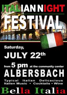 Ein Stück italienisches Lebensgefühl und Dolce Vita gibt's am Samstag, den 22. Juli, ab 17.00 Uhr am Bürgerhaus in Albersbach. Veranstalter der italienischen Nacht ist der Heimatverein Albersbach e.V.. Es erwarten Sie mediterranes Flair mit typischen Spezialitäten, leckere Cocktails und italienische Musik. Alle sind herzlich eingeladen mit uns zu feiern wie in Rimini und den Sonnenuntergang zu genießen wie in Capri.