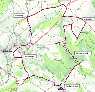 Vom „Pörrbacher Hof“ aus folgen wir dem Mühlenweg, wo wir gleich mit einer fulminanten Steigung beginnen. Ein Höhepunkt der Führung ist sicher die Tropfsteinhöhle im Hummestal. Wer mag, kann den Stollen besichtigen. Aber Vorsicht: es ist sehr kühl im Stollen und man kann sich nasse Füße holen.
