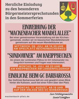 Los geht’s am Mittwoch, 09. Juli, um 18:30 Uhr mit der Einweihung der „Mackenbacher Mandelallee“. Wie man sich das zur Mandelblüte vorstellt, sind wir mit Schorle gerichtet (für die Kinder gibt es die mit Apfelsaft). Bringt dazu gerne eigene Gläser mit.