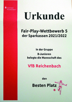 Unsere B-Junioren wurden hier ausgezeichnet. Die Urkunde wurde durch unseren Jugendleiter Frank Hertel und den Mannschaftskapitän der B-Jugend, Elias Eckhardt, in Empfang genommen.