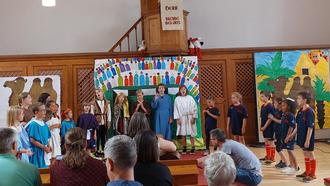Tobias Markutzik begleitet die kleinen Darsteller mitreißend und begeisternd auf dem Keyboard. Zu der Geschichte und den Liedern von Siegfried Fietz legen die Kinder los, was das Zeug hält und zeigen, was sie in vielen Proben gelernt und in der Jugendherberge vertieft haben. Da gibt‘s Jacobs Disco mit Tanz und Musik, da zieht eine Kamelkarawane durch die Kirche, werden Gefängnisse errichtet und ein Basar sowie der Palast des Pharaos mit viel Herzblut, Musik, Tanz und Mimik nachgestellt. Einige haben Mehrfachrollen und müssen sich schnell umziehen. Eine lockere Sprache und coole Sprüche zu den Geschehnissen auf der Bühne schaffen eine zeitgemäße Atmosphäre.