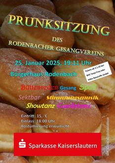 Der Gesangverein 1884 Rodenbach e.V. lädt wieder zur Prunksitzung am 25. Januar 25 ins Bürgerhaus nach Rodenbach ein. Um 19:11 Uhr startet die närrische Sitzung im großen Saal. Das bunte Programm ist wieder gut gefüllt mit Büttenreden, Garde- und Showtänzen und natürlich stimmungsgeladener Musik. Auch die ein oder andere Überaschung wird an diesem Abend präsentiert werden, lassen Sie sich überaschen!