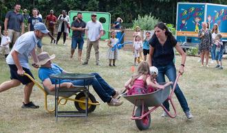 Neben einer Kirchenrallye für drei Altersklassen konnte man Basteln und Filzen, Schnitzen, Torwandschießen oder die vielen Spielangebote des Dorfspielwagens ausprobieren. Alle Kinder freuten sich an der Mitmachgeschichte und den schönen Luftballontieren. Ein besonderer Höhepunkt war das Schubkarrenrennen mit sportlichen Mamas und Papas am Ende des Festes.