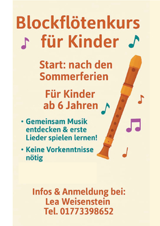 Im Kurs lernen die Kinder auf spielerische Weise erste Töne und Lieder auf der Blockflöte. Dabei geht es nicht nur ums richtige Greifen und Spielen, sondern vor allem um die Freude an der Musik. Gemeinsam wird musiziert, gelacht und entdeckt.