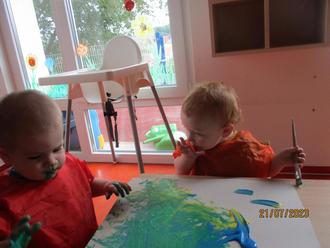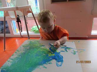 Auf einem großen Stück Pappe konntet ihr euch mit euren Händen, Pinseln und Schwämmchen austoben. Ganz konzentriert habt ihr die Farbe auf der Pappe und auf euch selbst verteilt und es ist ein kleines Kunstwerk entstanden!