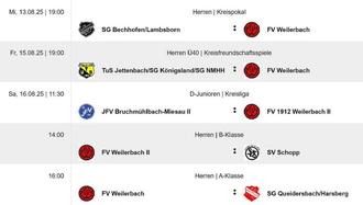 Unsere Zweitvertretung spielt gegen den SV Schopp (Samstag, 16.08.2025, 14:00 Uhr). Die erste Mannschaft trifft auf die SG Queidersbach/Harsberg (Samstag, 16.08.2025, 16:00 Uhr).