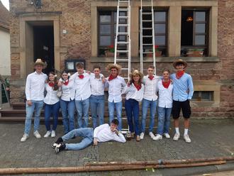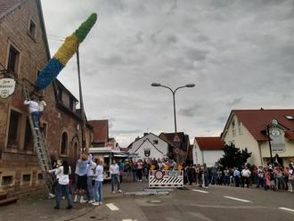 Auch in diesem Jahr fanden sich wieder junge Leute welche die Tradition der Dorfkerwe hoch hielten. Den in mühevoller Kleinarbeit kunstvoll gefertigten Strauß konnten sie am Sonntagnachmittag an der Gaststätte „Kääser“ in Erzenhausen nach anfänglichen Schwierigkeiten aufhängen. Im Anschluss an die mit launigen Worten vorgetragene Kerwerede führt die Straußjugend einen mittlerweile zur Tradition gewordenen Formationstanz auf, welcher ebenso wie die Kerwerede großen Anklang bei den zahlreich anwesenden Besuchern fand.