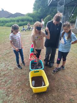 Der eigens gestaltete „Parcours der Sinne“ forderte die Kinder auf spielerische Weise heraus, ihre Wahrnehmung zu schärfen und Neues zu entdecken: Mit geschlossenen Augen und nackten Füßen erkundeten sie verschiedene Untergründe – von weicher Erde bis zum kühlen Wasser. Beim spielerischen Zugang in die Welt der Blindenschrift, klebten die Kinder Glitzersteine in Form ihres Anfangsbuchstabens auf Kieselsteine. Mit viel Neugier und Spaß errieten sie Düfte und erschmeckten verschiedenste Geschmacksrichtungen – ein Fest für alle Sinne!