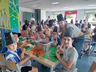 Die zweite Sommerwoche startete mit dem Batiken von T-Shirts. Mit leuchtenden Farben und individuellen Mustern entstanden wahre Kunstwerke, die nicht nur im Kleiderschrank, sondern auch im Herzen der Kinder einen festen Platz gefunden haben. Beim Sommer-Chaos-Spiel war Teamgeist gefragt: Die Kinder meisterten knifflige Rätsel, kreative Aufgaben und lustige Herausforderungen. Ob Denkaufgabe oder Bewegungsspiel – der Spaßfaktor war garantiert und das Chaos wohlorganisiert. Ein ganz besonderer Programmpunkt war das sommerliche Kochabenteuer mit Sascha, dem Meisterkoch der Grundschule Weilerbach. Gemeinsam mit den Kindern zauberte er ein köstliches Menü von Spaghetti Bolognese über Obstsalat bis hin zu einer leckeren Früchte-Quarkspeise.