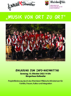Geworben wird für eine „Bläserklasse“ welche sich ab Oktober neu beim Musikverein formiert, in der Jung und Alt gemeinsam die Möglichkeit geboten wird ein Instrument zu erlernen, um dann gemeinsam in der Gruppe zu spielen. Wie das alles funktioniert erfahren Interessierte bei Kaffee und Kuchen an dem Infotag am 15. Oktober 2022 im Bürgerhaus Kollweiler.