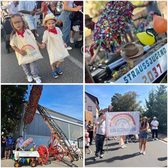 Auch in diesem Jahr war die Kita Regenbogen bei bestem Wetter wieder mit viel Freude beim Kerweumzug vertreten. Unter dem Motto „Straußjugend 2037“ präsentierten die Kinder und Erzieherinnen eine bunte und fröhliche Gruppe, die bei den Zuschauern am Straßenrand für viele strahlende Gesichter sorgte.