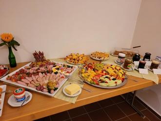 Das reichhaltige Frühstücksbuffet ließ keine Wünsche offen. Von den üblichen Frühstückszutaten wie Marmelade, Wurst, Lachs, Käse über gefüllte Eier, Würstchen im Schlafrock zu Gemüse- und Obstplatte und selbstgebackenem Kuchen, dazu passenden Getränken und noch einiges mehr, ging keiner hungrig nach Hause.