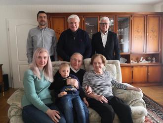 sitzend von re.: die Jubilarin mit Ehemann, Enkel und Schwiegertochter; stehend von re.: 1. Beigeordneter der Verbandsgemeinde Ernst Müller, Kreisbeigeordneter Dr. Walter Altherr, Ortsbürgermeister Markus Schick