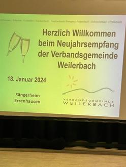 Der diesjährige Neujahrsempfang der Verbandsgemeinde Weilerbach fand im Sängerheim Erzenhausen statt. Bürgermeister Ralf Schwarm zeigte sich sichtlich erfreut, dass trotz der widrigen Wetterverhältnisse mit eis- und schneebedeckten Straßen, so viele Gäste kamen und das Sängerheim füllten.