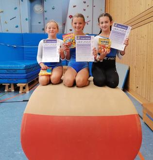 Im ersten Durchgang zeigten die jüngeren Turnerinnen Mia Jost, Lea Blauth und Martha Schwarzbach in den Gaubestenkämpfen ihre Übungen.