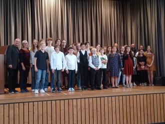 Für eine besondere Klangfarbe sorgten Marleen Regin und Mathis Straßer aus der Celloklasse von Christine Rutz. Sie begleitete Marleen am Cello, Mathis wurde von seinem Vater Clemens am Klavier begleitet.