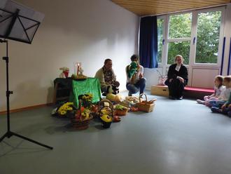 Das erste Fest im neuen Kitajahr, begannen wir mit dem Erntedankfest. Unsere Kinder brachten Obst und Gemüse mit. Gemeinsam mit unserer Pfafferin Fr. Dötzkirchner, feierten wir den Gottesdienst in unserer Turnhalle. Die Kinder durften u.a ihr Mitgebrachtes zeigen und ihre Gedanken zu Erntedank erläutern. Zum Abschluss sangen wir gemeinsam die Lieder "Wir sind eingeladen zum leben," sowie "Danke"!