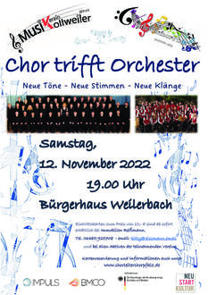 Am Samstag, den 12. November 2022 um 19 Uhr veranstaltet der Chorleiterchor Pfalz und der Musikverein Kollweiler, unter dem Motto „Chor trifft Orchester“ im Bürgerhaus Weilerbach, ein großer Gemeinschaftskonzert.