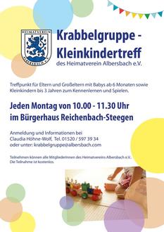 Du suchst eine Krabbelgruppe oder Kleinkindertreff? Dann komm zu uns! Wir, die Krabbelgruppe des Heimatverein Albersbach e.V., treffen uns jeden Montag von 10.00 - 11.30 Uhr im Bürgerhaus Reichenbach-Steegen, Albersbacher Str. 3B. Unsere Gruppe ist für Eltern und Großeltern mit Babys ab 6 Monaten sowie Kleinkindern bis 3 Jahren zum Kennenlernen und Spielen. Kostenlos teilnehmen können alle MitgliederInnen des Heimatvereins. Du bist noch kein Mitglied? Kein Problem! Komm einfach an einem Tag schnuppern. Wenn du bleiben willst, dann kannst du für nur 12 Euro pro Jahr Mitglied werden und profitierst von allen Vorteilen des Vereins. Mehr Informationen erhaltet ihr bei Claudia Höhne-Wolf, Tel. 01520 / 597 39 34 oder unter: krabbelgruppe@albersbach.com.