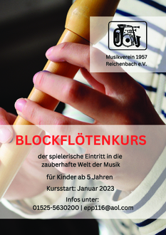 Der Musikverein 1957 Reichenbach e.V. bietet ab dem neuen Jahr 2023 wieder einen Blockflötnkurs für Kinder ab 5 Jahren an.