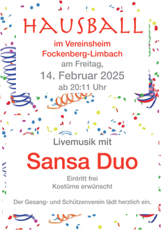 Der Gesangverein 1911 Fockenberg-Limbach e.V. und der Schützenverein Fockenberg-Limbach laden ein zum Hausball am Freitag, den 14.02.2025 ab 20:11 Uhr ins Vereinsheim.