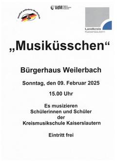 Am Sonntag, 02.02. findet um 15.00 Uhr im Bürgerhaus Weilerbach ein „Musiküsschen“-Vorspiel der Kreismusikschule statt. Das Programm wird von Kindern bis 10 Jahren gestaltet. Für einige der Akteure ist dies ein besonderer Tag, denn es ist ihr erster öffentlicher Auftritt.
