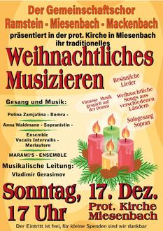 Der MGV Liederkranz Mackenbach und ihre Sängerkameraden aus Miesenbach und Ramstein laden alle musikinteressierten Freunde zum weihnachtlichen Musizieren in die protestantische Kirche nach Miesenbach, Ringstraße 16, ein. Hier veranstaltet am Sonntag, den 17. Dezember 2023 ab 17:00 Uhr die Chorgemeinschaft Mackenbach, Miesenbach und Ramstein ihr alljährliches Weihnachtskonzert.