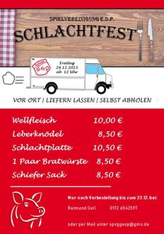 Am Freitag den 29.12.2023 findet das traditionelle Schlachtfest der Spielvereinigung ESP statt. Zum ersten Mal seit der Corona Pandemie gibt es das dieses Jahr auch wieder im Sportheim in Schwedelbach.