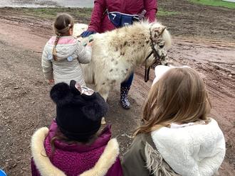 Letzte Woche hatten wir ein ganz besonderes Ereignis in der Kita Mackenbach. Wir bekamen Besuch von Kalli, dem Pony. Aufgeregt zogen wir uns an und gingen nach draußen. Kallis Besitzerin wartete schon auf uns.