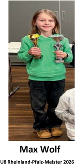 Ein herausragender Erfolg! Mit dieser Meisterschaft gewann Max Wolf auch das regionale U8-Kinderschachturnier 2026. Max Wolf hat inzwischen einige Turniere gewonnen und nun auch die Rheinland-Pfalz-Meisterschaft, einfach großartig!