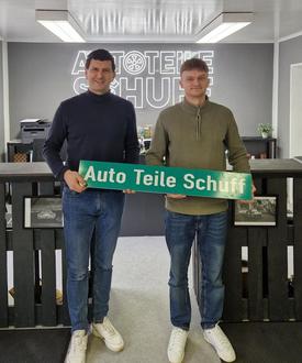 Ortsbürgermeister Daniel Schäffner hat Janek Schuff, dem Geschäftsführer des neuen Autoteilehandels in der Siedlung 19a, Mackenbach, zur Geschäftseröffnung gratuliert.