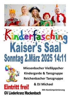 Am 02. März 2025 ab 14:11 Uhr findet im festlich geschmückten Kaisers Saal unser alljähriger weithin bekannter Kinderfasching statt.