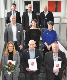 Die Dienstjubilare Daniela Torgau, Jürgen Kles und Reiner Pint, dahinter Landrat Andreas Kruppert, Alexandra Tusch, Personalrat und Amtsleiterin Anita Reiter. In der hinteren Reihe von links, Geschäftsbereichsleiter Thomas Kreutz, Amtsleiter Martin Fuchs und Büroleiter Carl Diederich.