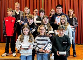 Die Teilnehmer des Kreisentscheids freuten sich über tolle Buchpräsente. Vordere Reihe von links Louisa Hammes, Greta Werner, Can-Taylor Krause. Mittlere Reihe: Tom Kimmlingen, Jana Schermer, Paula Banz. Hintere Reihe: Vorjahressieger Jan Küßner, Kulturamtsleiter Herbert Fandel, Anna Theisen, Jurorin Sabine Rehm, Fynn Hauser, Jurorin Marie-Chantal Klees, Leon Strauch und Maren Beckfeld (Foto: Kreisverwaltung)