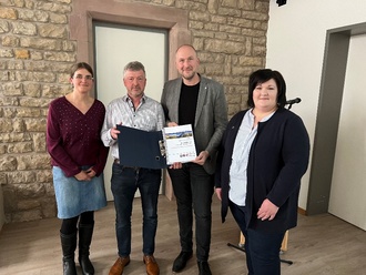 Trimport im Gemeindehaus: Übergabe des Ergebnisberichtes des Zukunfts-Check Dorf am 05. März 2023 an den Ortsbürgermeister Horst Bares, die Kümmererinnen Tanja Bares und Tanja Palzer sowie die Bürgerinnen und Bürger durch Landrat Andreas Kruppert.