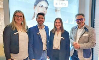 Der Erste Kreisbeigeordnete Michael Ludwig mit dem Team der neuen VR Eins-Filiale (von links: Victoria Hargarten, Marcello Heinsch und Margarethe Theis).