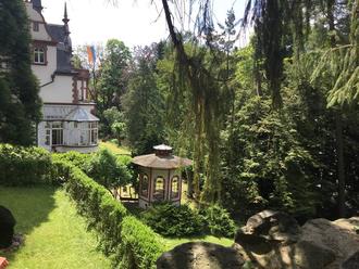 Rudolf Haas (1843-1916), der Leiter der Neuhoffnungshütte im Dilltal, erfüllte sich seinen Lebenstraum mit der neuen Villa Haas in der Nähe des Unternehmensstandortes bei Sinn. Der Architekt Ludwig Hofmann entwarf nicht nur die malerische späthistoristische Villa mit zahlreichen ebenso repräsentativen wie funktionalen Nebengebäuden, sondern auch den reizvollen Bergpark, in dem man unter anderem wunderbare Gehölzbestände und im Mai die Rhododendronblüte erleben kann. Noch bis Ende der 1960er Jahre war hier bis hin zur Championzucht oder Trocken- und Fermentierungsmöglichkeiten für Tabak die vollständige Selbstversorgung möglich. Der heutige Besitzer, der mit seiner Familie das stark vernachlässigte Anwesen ab 1978 restauriert hat, wird die Teilnehmer der Studienfahrt führen.
