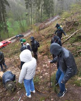 Zunächst führte Forstamtsleiter Olaf Böhmer kurz in das Thema Wald und Klimawandel ein, anschließend ging es konkret um die ausgewählten Baumarten und die richtige Technik zum Ausheben des Pflanzloches, Einsetzen der Bäumchen und Anbringen des Verbissschutzes. Alle Anwesenden packten kräftig mit an und zeigten trotz des eher widrigen Wetters großes Engagement.
