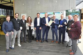 Symbolische Übergabe am 20. April 2023 (von links): Jan Mathar und Stefan Borens (Kreisverwaltung), Joachim Hansen und Ursula Berrens (Mitfahrbank Initiative Speicher), Marcus Konrad (Bürgermeister VG Speicher), Landrat Andreas Kruppert, Andy Fuchs, Dr. Frank Wolter und Ralph Wahnschafft (Toyota Mobility Foundation) sowie Andrea Ennen (Caritas Westeifel). Foto: Konder/Kreisverwaltung